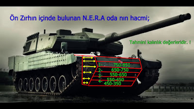 • Tankın Ön Gövde Zırhı:  Tankın Ön gövdesi Leopard / C1 Ariete gibi  şekle sahip olduğunu düşünüyor ve altay tankının ön gövde zırhını buna göre şekillendirip kalınlık değerlerini aşşağıdaki resimdeki gibi tahmin ediyoruz… ancak zırh kalınlıkları normal olarak yere doğru düşüşe geçecektir.. çünkü tankın her tarafını 850 mm zırh kalınlığında yapmak tankı aşırı ağır yapar… diğer yandan Altay tankının ön gövdesi oldukça kuvvetli kombineli kaynaklı yapıya sahiptir RPG-7V ,Kornet,Konkurs,Metis-1,Tow un Bu tankı Önden Delemeyeceğini düşünüyoruz. ayrıca ön gövdesindeki bu düzenli hacim tankın ön gövdesinde gelen herhangi bir hasar sonucu tamiri oldukça kolaylaştırır..