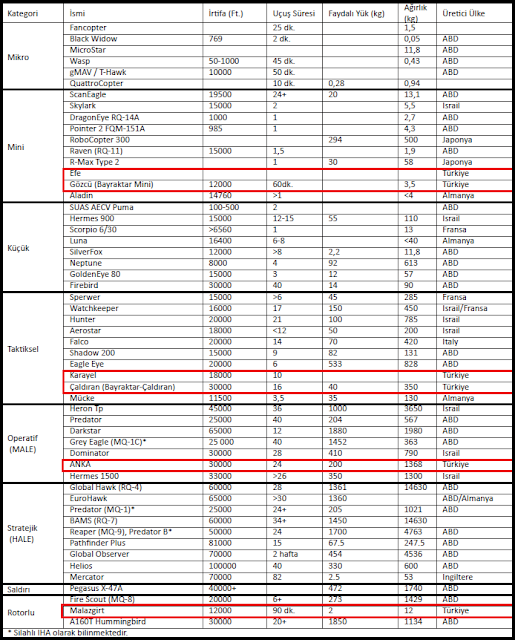 Tabloda mevcut olan insansız hava araçlarının büyük çoğunluğu silahsız, keşif amaçlı görevler için geliştirilmiş platformlardır. İHA teknolojisinin öncüsü ABD ile başlayan süreçte bütün kullanıcı ve üretici ülkelerde İnsansız hava araçlarının Keşif/Saldırı konjektüründeki oranı herzaman ters orantılı olmuştur. Doğal olarak öncelikle keşif/gözetleme platformları önce kullanılıp ardından daha gelişmiş silahlı versiyonlar kullanılmıştır. Dökümanların yayınlandığı 2012-2013 yıllarında ABD silahlı kuvvetlerinin sahip olduğu 7 bin 448 İHA içindeki silahlı İHA sayısı sadece 241 adettir ve bu sayı toplam içinde %3 düzeyinde bir orana denk gelmektedir. Zamanla elbette bu oran daha da yükselmiştir. Güncel raporlara göre sadece ABD’li şirketler tarafından üretilen Silahsız/Silahlı 294 platform bulunmakta.Aynı şekilde öncülüğünü ABD yapmış olsa da İHA teknolojisinin yaygınlaşmasıyla birlikte birçok ülke farklı konseptlerde ve boyutlarda insansız hava araçları geliştirebilir hale gelmiştir.