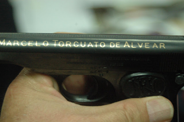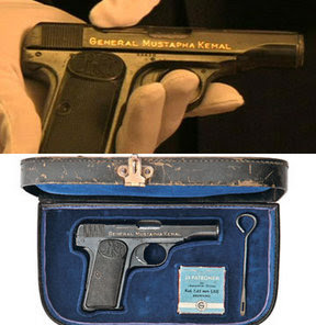 Döneminin önemli siyasi liderlerine hediye ettiği silahlarla bilinen Arjantin Cumhurbaşkanı Alvear’ın  Atatürk’e verilmek üzere hazırlattığı  33418 seri numaralı FN Herstal (Avrupa’nın en büyük silah üreticisi) firması üretimi “Browning” marka 1910 Belçika yapımı tabancanın üzerinde, namlu kapağının üst kısmında Cumhuriyetin ilanı olan ‘29-OCT-1923’ tarihi, namlu takımının sol üst kısmında “MARCELLO TORCUATO DE ALVEAR” sağ kısımda ile yine altın harflerle ‘GENERAL MUSTAPHA KEMAL’ “yazıyor.