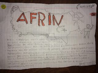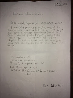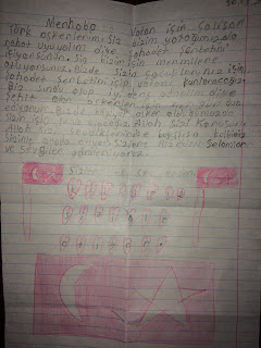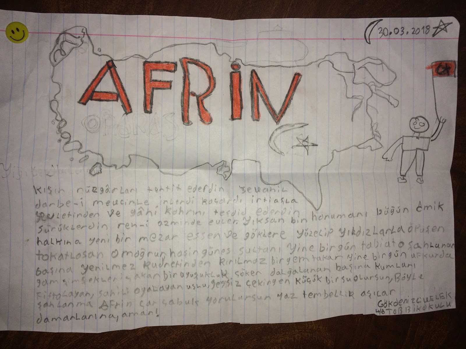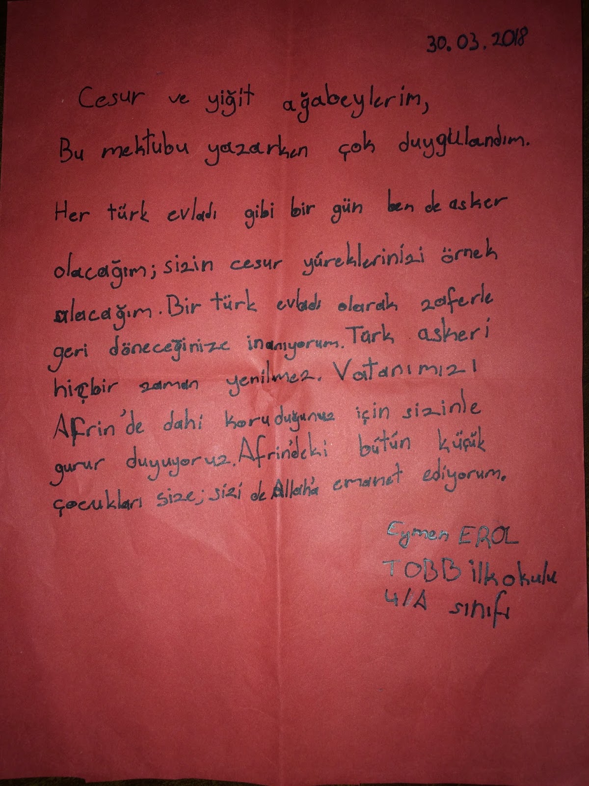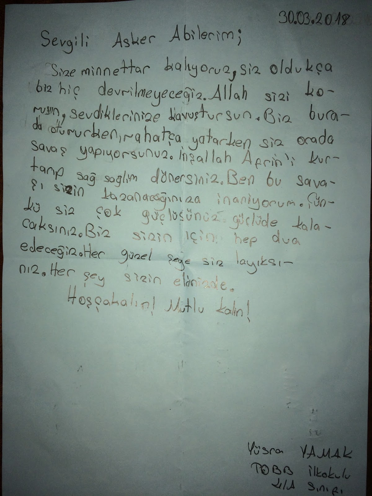 Değerli kardeşlerimiz, biz Mehmetçik abileriniz Afrin’den size selamlar eder, mektuplarınızı gönderdiğiniz için teşekkür ederiz, çok sağolun.”