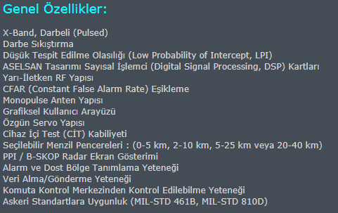 Aselsan tarafından geliştirilen ve 1999 yılından itibaren envantere alınan gözetleme/atış tanzim radarıdır. Her türlü hava koşullarında 38 km menzil içerisinde alçaktan uçan hedeflerin tespitinde ve hassas topçu atış tanzimi görevlerinde kullanılır. Elektronik harbe karşı dayanıklıdır (LPI radarlar gibi düşük tespit olasılıklı radar özelliği taşır)