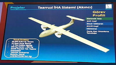 AKINCI Projesi adı verilen İHA, 45 bin feet irtifaya (13.160m) erişebilecek olan insansız hava aracı, 14 saat havada kalabilecek. Faydalı yük ağırlığı 1-1.5 ton olması planlanmakta.